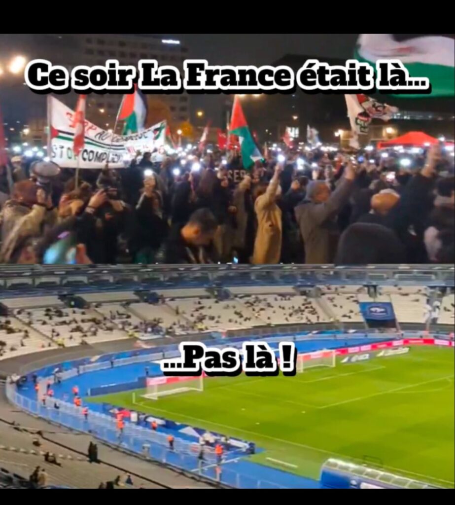 Tout symbolisme palestinien a été interdit par la France aujourd’hui lors du match contre Israël à Paris. Un jeune spectateur raconte qu’ils lui ont même fait retirer son maillot, dans le stade. Pendant ce temps, les supporters israéliens brandissaient ouvertement les symboles de leurs forces d’occupation, sans aucune restriction.