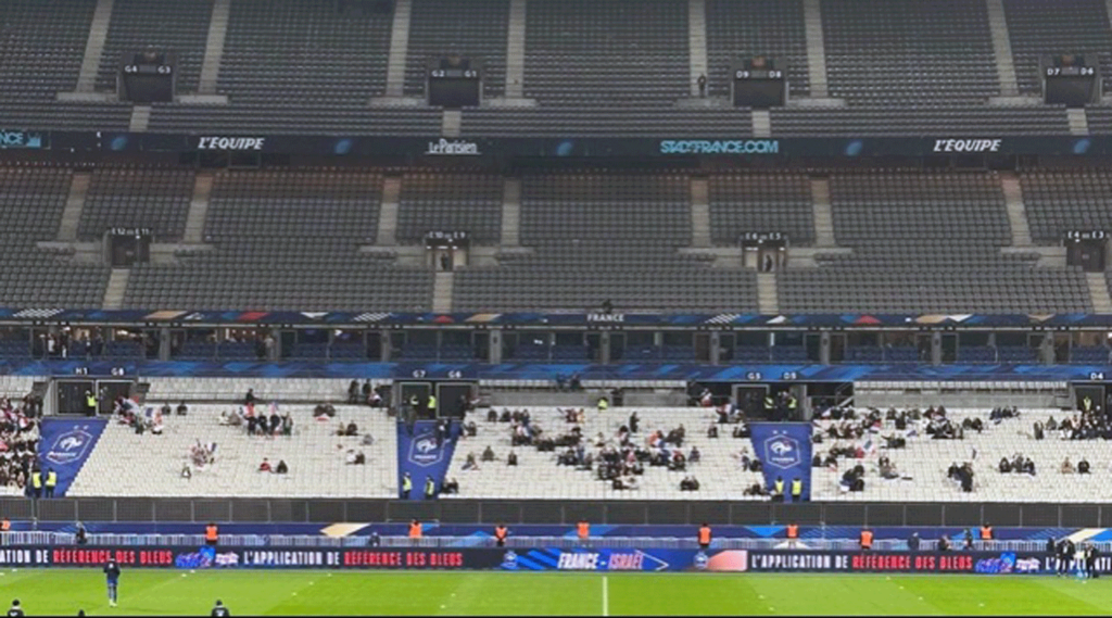 Le match de la honte au Stade de France va débuter. De la fumée pour masquer le Stade vide ! Il n’y a que les complices de crime contre l’humanité dans ce stade. Nous ne sommes pas antisémite, nous ne sommes juste pas complice de criminels !