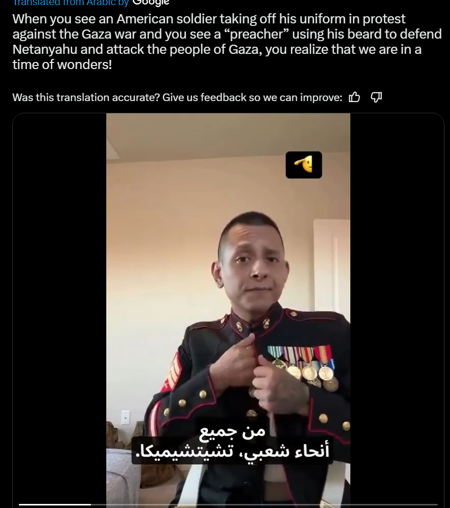Quand vous voyez un soldat américain enlever son uniforme pour protester contre la guerre à Gaza et que vous voyez un « prédicateur » utiliser sa barbe pour défendre Netanyahu et attaquer la population de Gaza, vous réalisez que nous sommes dans une époque de merveilles !